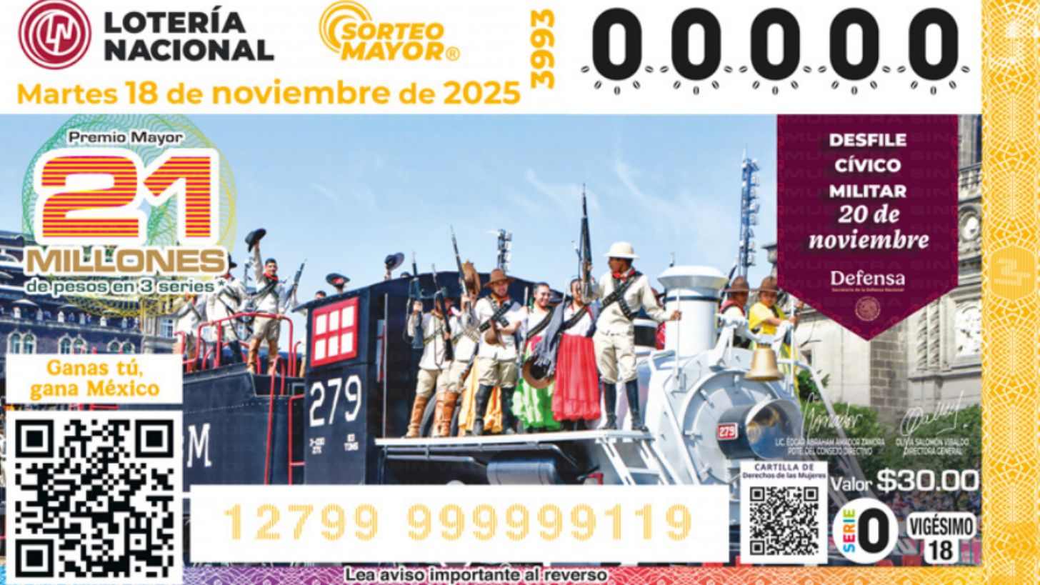 Ciudad de México.-Hoy es martes 18 de noviembre de 2025 y es día de Sorteo Mayor de la Lotería Nacional. ¿Compraste tu cachito? Si la respuesta es sí, TRIBUNA trae para ti la lista completa de ganadores de esta noche. Hoy se celebra el Sorteo Mayor No. 3993, que hace referencia al Desfile Cívico Militar del 20 de noviembre. Hay que recordar que cada año en la Ciudad de México y en muchas otras de diferentes estados se celebra el inicio de la Revolución Mexicana mediante un acto patrio.