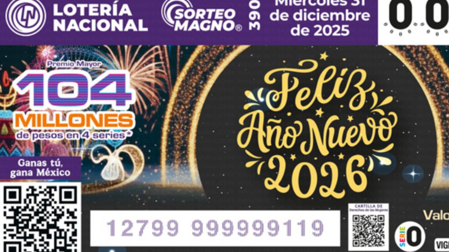 Ciudad de México.- Hoy miércoles 31 de diciembre de 2025 es día de Sorteo Magno en la Lotería Nacional y, si compraste tu boleto y te sientes con suerte, TRIBUNA trae para ti la lista completa de ganadores de esta noche. Hoy se celebra el Sorteo Magno número 390, que hace alusión a la llegada del Año Nuevo 2026 y el Fin de Año de 2025. Aquí te presentamos los números ganadores.