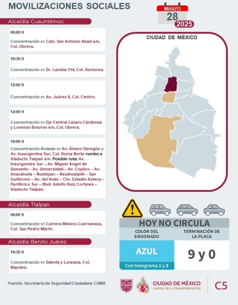 De igual forma, en la alcaldía Cuauhtémoc a las 10:30 horas se prevé una protesta del colectivo Tonantzin en los Juzgados Penales de la Ciudad de México, en Dr. Lavista 114, colonia Doctores. El propósito de esto es para pedir a las autoridades la imposición de prisión preventiva contra un presunto culpable durante la audiencia que se llevará a cabo en el transcurso del día. Es necesario mencionar que se descarta la posibilidad de que se realicen bloqueos como medida de protesta.