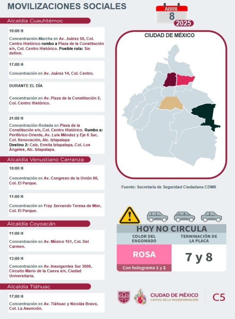Ahora, con respecto a la alcaldía Cuauhtémoc alrededor de las 10:00 horas comenzará una movilización donde estarán involucrados extrabajadores de la Extinta Ruta 100 del Hemiciclo a Benito Juárez en Avenida Juárez 50, colonia Centro, rumbo al Zócalo de la Ciudad de México, en Plaza de la Constitución sin número, colonia Centro. El objetivo es exigir el pago del finiquito por liquidación del 28 por ciento, intereses, dividendos y utilidades del fideicomiso F/100.