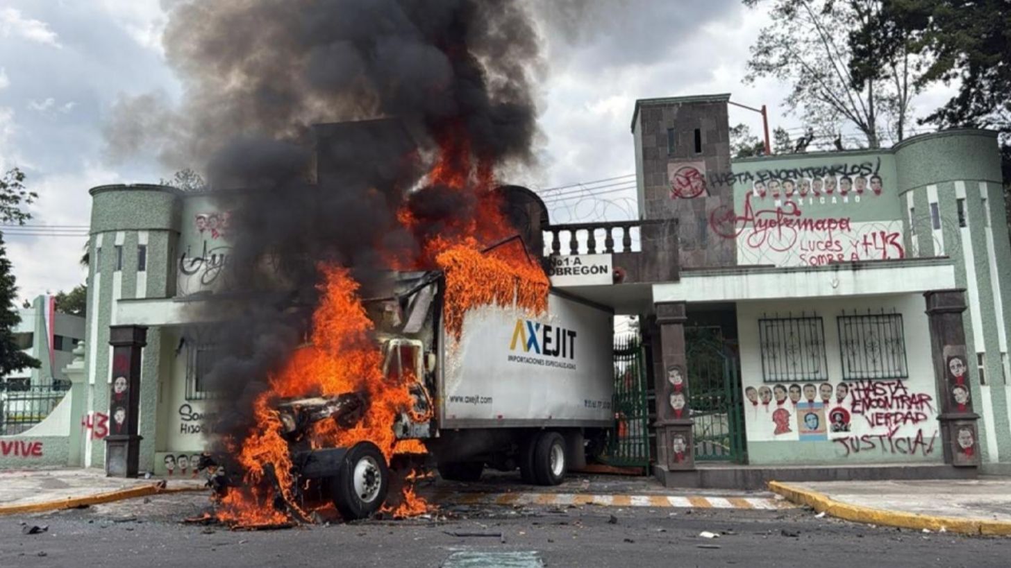 En protesta por los 11 años de la desaparición de los estudiantes de Ayotzinapa, familiares y estudiantes derribaron una de las puertas de Campo Militar 1 este jueves en el Estado de México; horas más tarde un camión fue incendiado frente a elementos de seguridad que resguardaban el lugar.