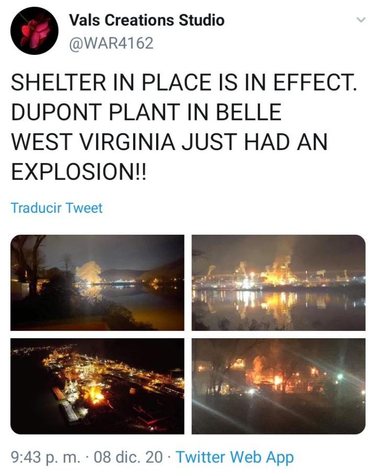 Virginia, Estados Unidos.- Durante la noche de ayer martes 8 de diciembre se reportó una fuerte explosión e incendio en una planta química de la ciudad de Belle, Virginia Occidental, que habría dejado como saldo al menos dos personas lesionadas.