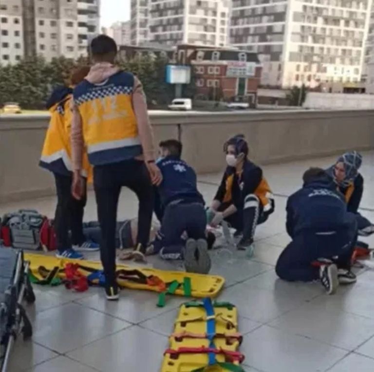Imágenes de la cámara de seguridad muestran el impactante momento en que Ismail cayó a gran velocidad y golpeó el suelo detrás de un transeúnte desprevenido, en el barrio de Gokevler en la ciudad turca de Estambul.