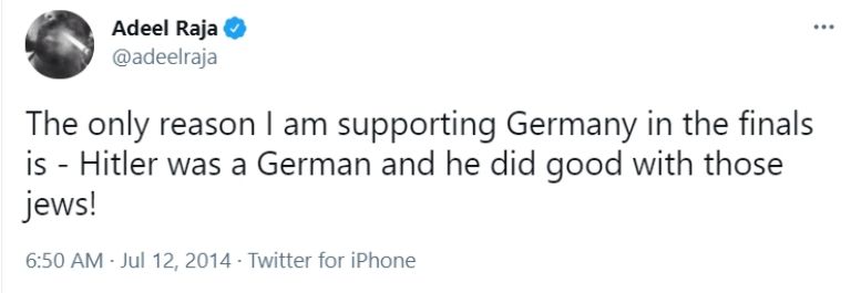 Adeel Raja escribió en su cuenta de Twitter un mensaje que terminó por borrar, no obstante, usuarios destacaron que esta no es la primera vez que se expresaba de esta m manera, por lo cual se ha pedido que se le investigue por incitar al odio.