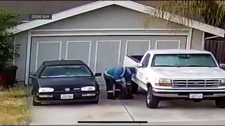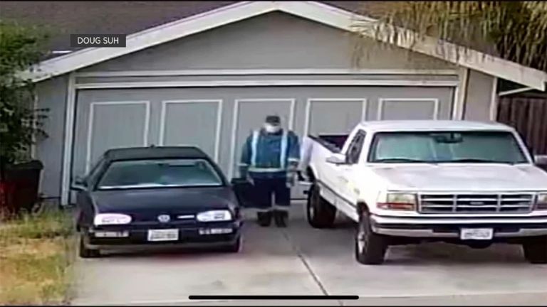 Luego camina hacia el lado del conductor, se toma su tiempo para entrar y finalmente se aleja de su casa en el vecindario Ramblewood de San José.