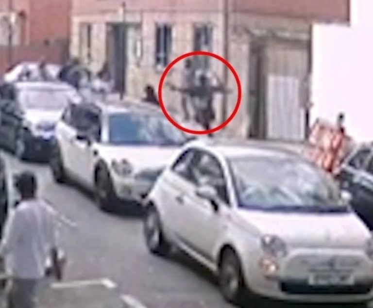 Las imágenes capturadas por las cámaras, muestran a dos grupos parados en la calle antes de que un matón saque un machete de sus pantalones y se abalanza sobre su víctima.