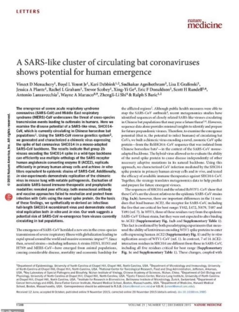 Dicho informe fue realizado por el Jefe de Laboratorio de Virología de Wuhan, Shi Zhengli y un experto de la Universidad de Carolina del Norte, Ralph Baric, en él, advertían sobre el peligro potencial que representaba su propia investigación, además explicaban sobre los riesgos de continuar con dichos estudios. Este documento data del año 2015.