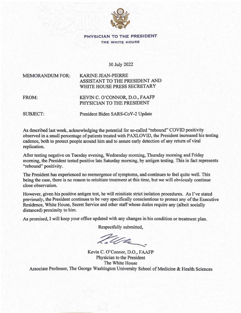 Apenas el pasado 27 de julio, poco después de una semana de haber revelado su segundo contagio por coronavirus, la Casa Blanca anunció que el mandatario dio negativo a la prueba que le fue aplicada para detectar el contagio, por lo que se dijo que ya no debía estar en aislamiento obligatorio y así podría retomar sus actividades cotidianas.