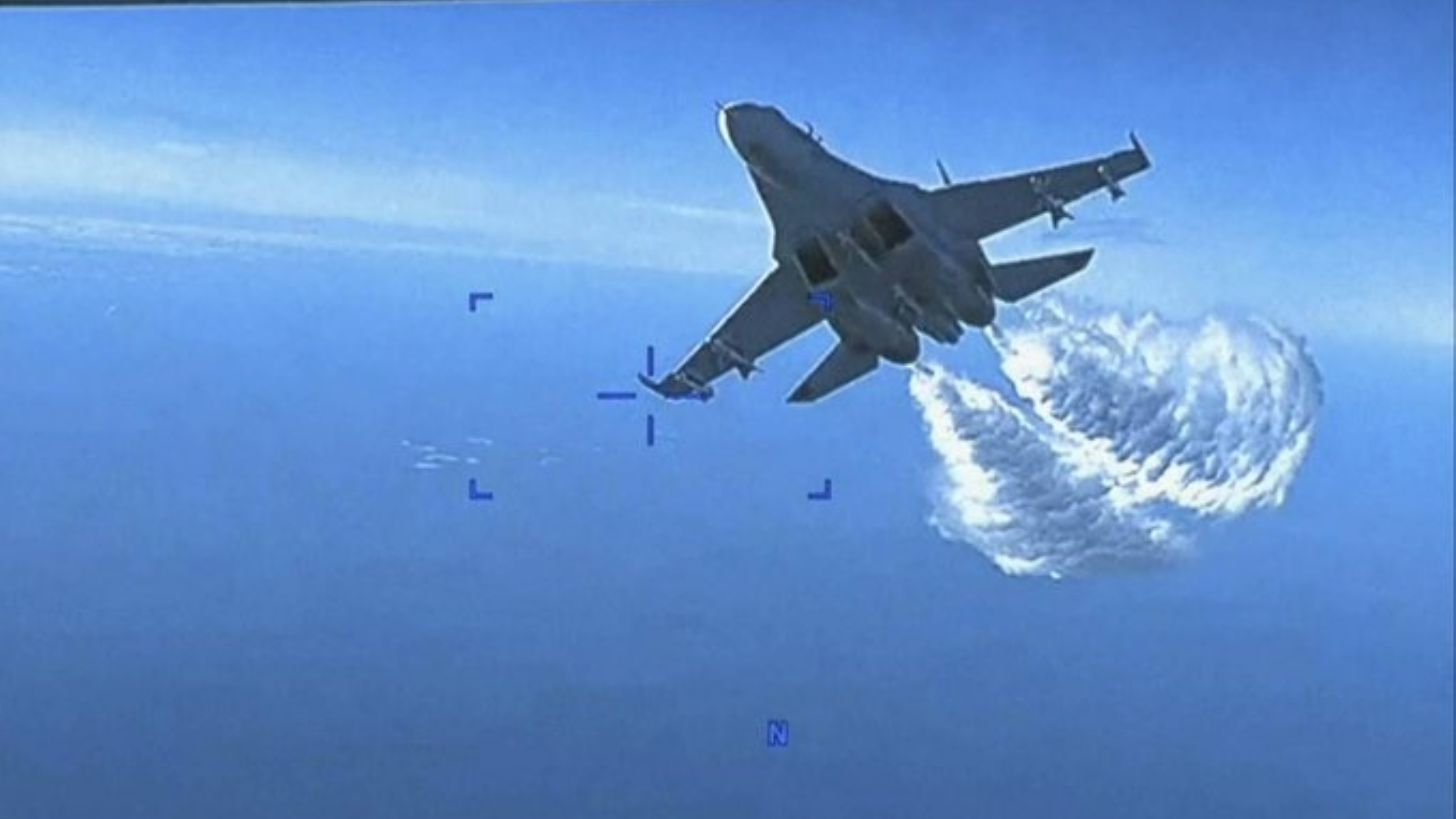 De acuerdo con las imágenes difundidas por el Pentágono, en cuestión de 42 segundos se mostró al avión de caza SU-27 acercarse al dron MQ-9 y rociarlo con el combustible a modo de causar que este se incendiara tras el choque. Debido a que el dron había sido interceptado, autoridades estadounidenses informaron que se había abandonado la unidad en el Mar Negro para después haber con Rusia al respecto.