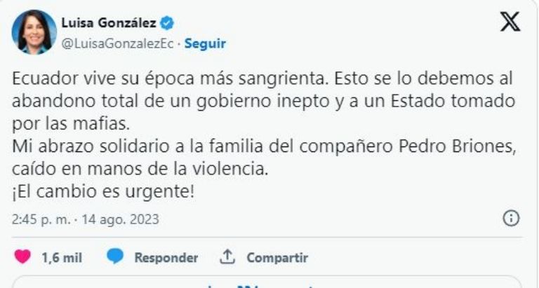 "Ecuador vive su época más sangrienta. Esto se lo debemos al abandono total de un gobierno inepto y a un Estado tomado por las mafias. Mi abrazo solidario a la familia del compañero Pedro Briones, caído en manos de la violencia. ¡El cambio es urgente!", escribió la candidata a través de su cuenta de X, antes conocida como Twitter. La alcaldía de Esmeraldas también se pronunció por la muerte del dirigente.