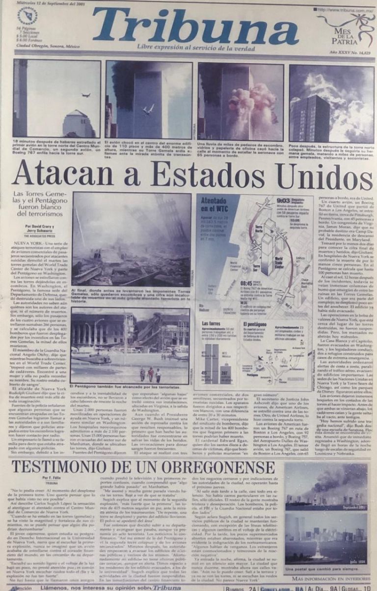 El miércoles 12 de septiembre, TRIBUNA llevó como su titular principal 'Atacan a Estados Unidos'; en su bajada para dar pase a la nota se leía: 'Las Torres Gemelas y el Pentágono fueron blanco del terrorismo'.