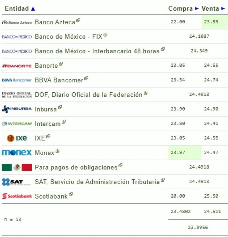 Banamex registra un precio de 23.52 a la compra y 24.50 a la venta; por su parte Banco Azteca registra un precio de 23.59 a la venta y 22.00 a la compra.