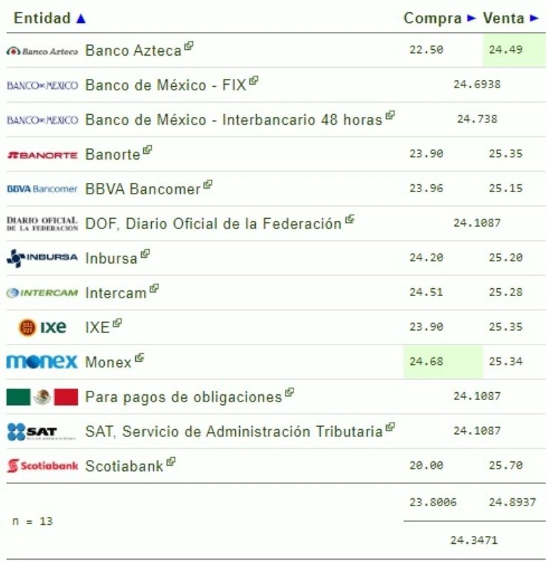Banamex registra un precio de 23.52 a la compra y 24.50 a la venta; por su parte Banco Azteca registra un precio de 24.49 a la venta y 22.50 a la compra.