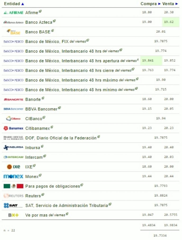 Banorte registra un precio de 18.60 a la compra y 20.00 a la venta; por su parte Banco Azteca registra un un incremento en el precio con 19.62 a la venta y 19.00 a la compra. En tanto que BBVA Bancomer registra un precio de 20.05 a la venta y 19.15 a la compra, así como Citibanamex, que registra un precio de 20.23 a la venta y 19.23 a la compra.
