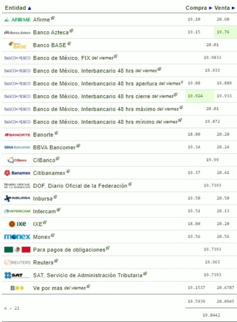 Banorte registra un precio de 18.80 a la compra y 20.20 a la venta; por su parte Banco Azteca registra un un incremento en el precio con 19.76 a la venta y 19.15 a la compra. En tanto que BBVA Bancomer registra un precio de 20.24 a la venta y 19.34 a la compra, así como Citibanamex, que registra un precio de 20.41 a la venta y 19.37 a la compra.