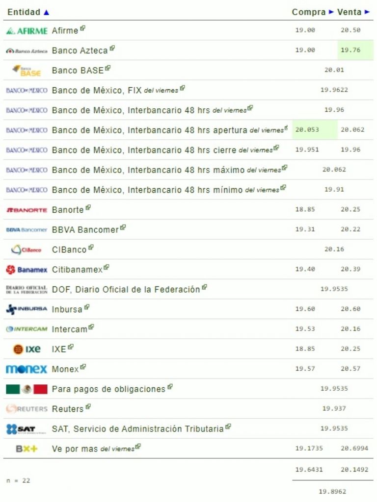 En los principales centros bancarios de México, como lo pueden ser Citibanamex, Banorte, y Banco Azteca, la divisa norteamericana se oferta en un promedio de 20.14 pesos a la venta y 19.64 pesos a la compra.