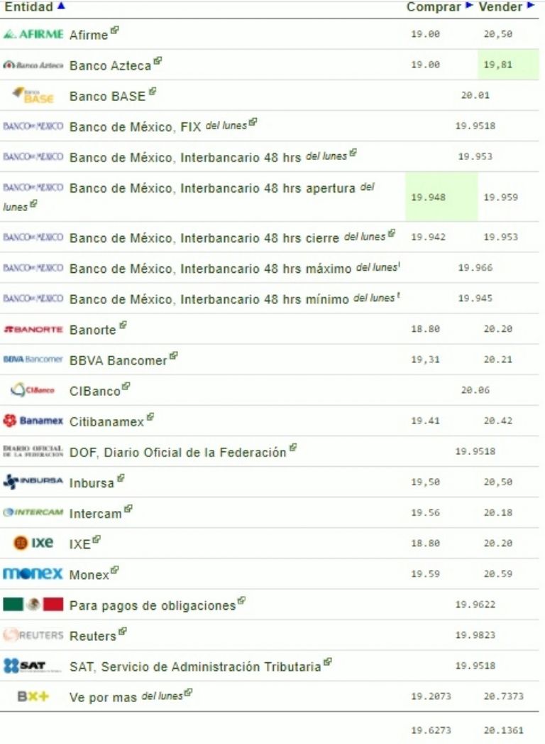 En los principales centros bancarios de México, como lo pueden ser Citibanamex, Banorte, y Banco Azteca, la divisa norteamericana se oferta en un promedio de 20.13 pesos a la venta y 19.62 pesos a la compra.