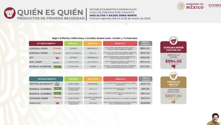 Las declaraciones hechas por el funcionario fueron debido a que señaló cuáles son los establecimientos con precios más altos por los 21 productos evaluados y en el caso de Sonora, Soriana Hiper Vado del Río, ubicado en Hermosillo, es el lugar más caro de la zona norte al dar un total de 994.05 pesos en comparación con los 807.90 pesos que se gastan en la Central de Abasto de Monterrey.