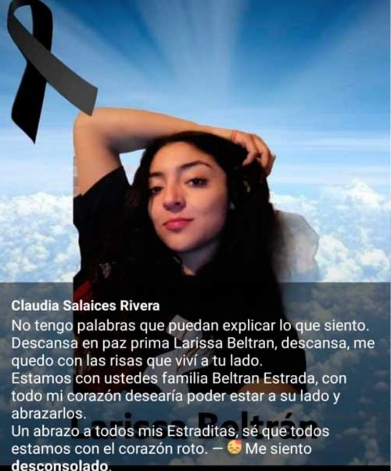 Una primera de la fallecida le escribió en Facebook: "No tengo palabras que puedan explicar lo que siento. Descansa en paz prima Larissa Beltran, descansa, me quedo con las risas que viví a tu lado".