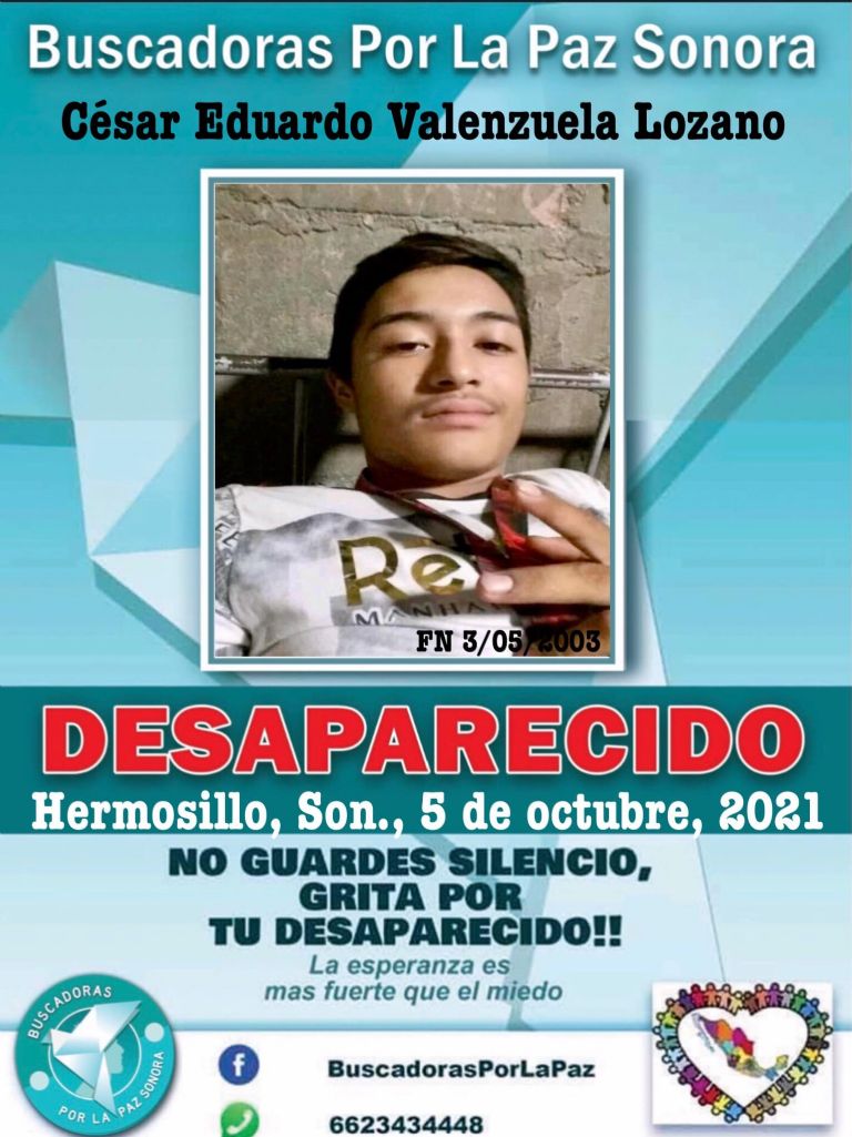 Ciudad Obregón, Sonora.- Durante esta semana, el colectivo Buscadoras por la Paz informó sobre la repentina desaparición de César Eduardo Valenzuela Lozano en Hermosillo, Sonora y solicitó el apoyo la comunidad para encontrarlo.