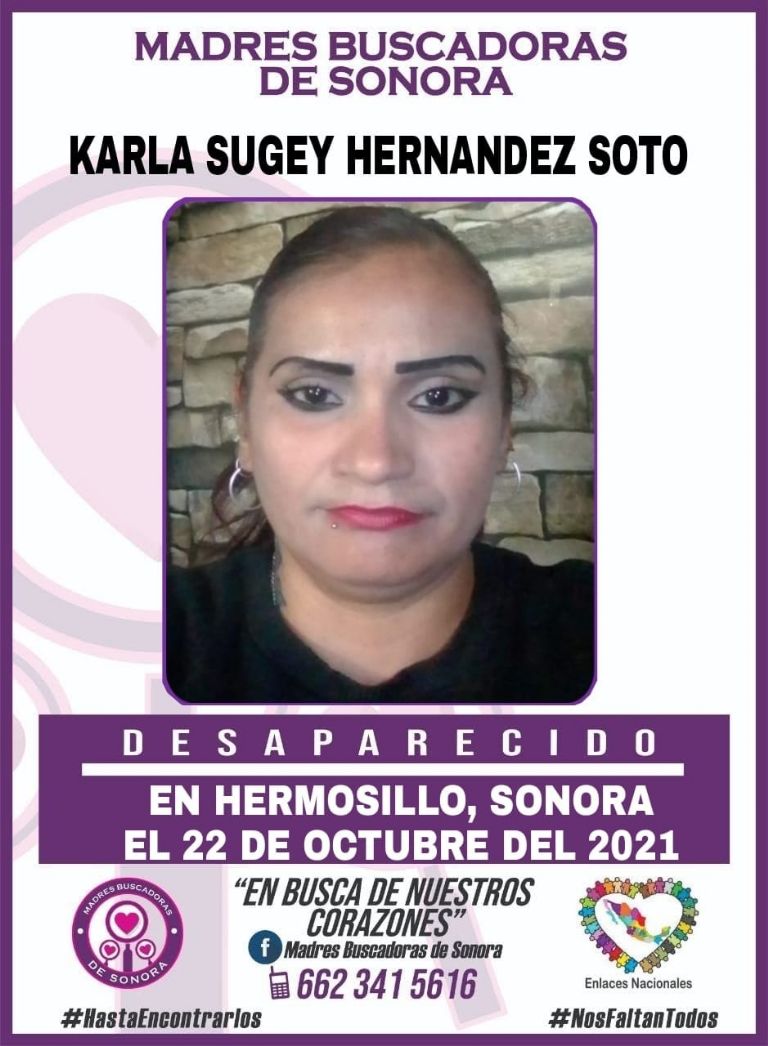 Hermosillo, Sonora.- Este domingo 24 de octubre, el colectivo Madres Buscadoras de Sonora solicita la ayuda de la comunidad para localizar a Karla Sugey Hernández Soto, señora que desapareció hace unos cuantos días en su natal Hermosillo, Sonora.