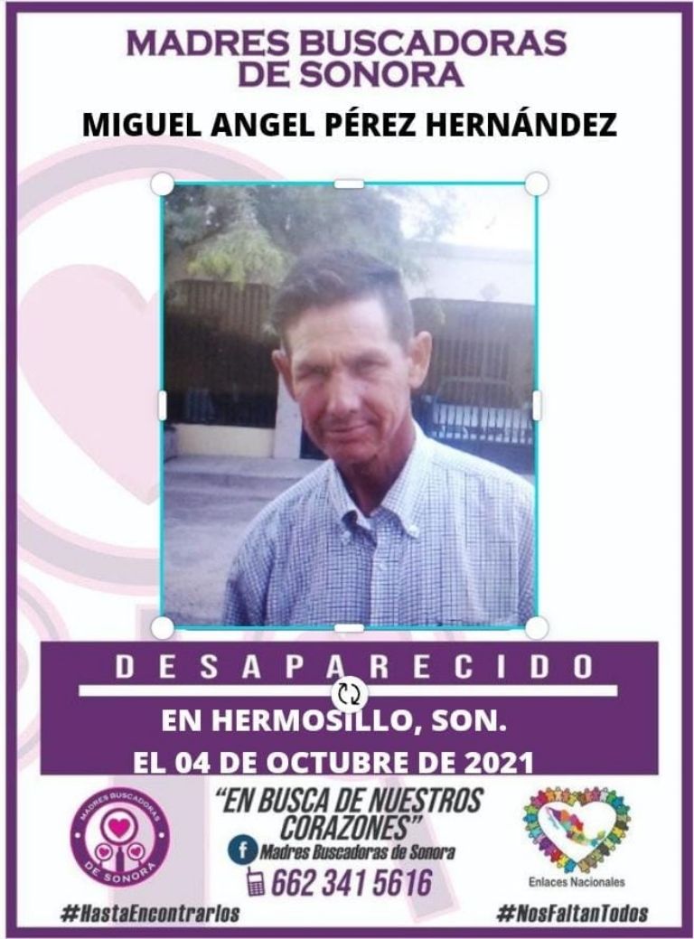 Hermosillo, Sonora.- El colectivo Madres Buscadoras de Sonora reportó la desafortunada desaparición del señor Miguel Ángel Pérez Hernández, de quien no se sabe nada desde hace varias semanas en la ciudad de Hermosillo, Sonora.