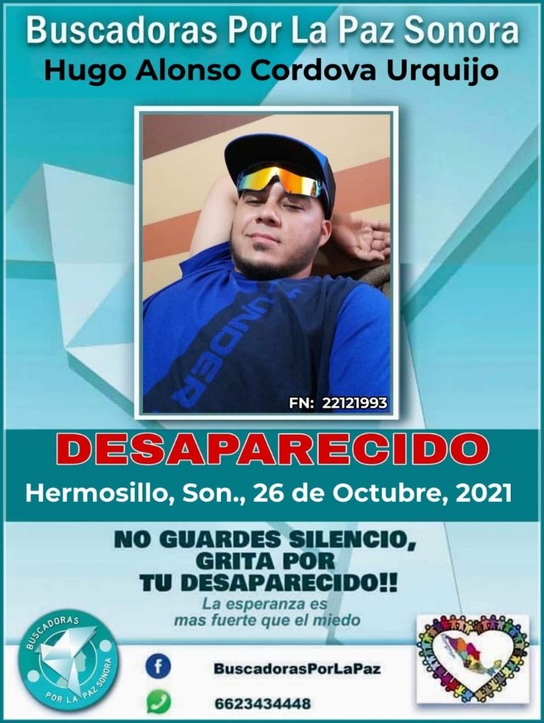 Hermosillo, Sonora.- La tarde de este jueves 28 de octubre, el colectivo Buscadoras por la Paz informó sobre la infortunada desaparición de Hugo Alonso Córdova Urquijo, de quien nada se sabe desde hace varios días en Hermosillo, Sonora.