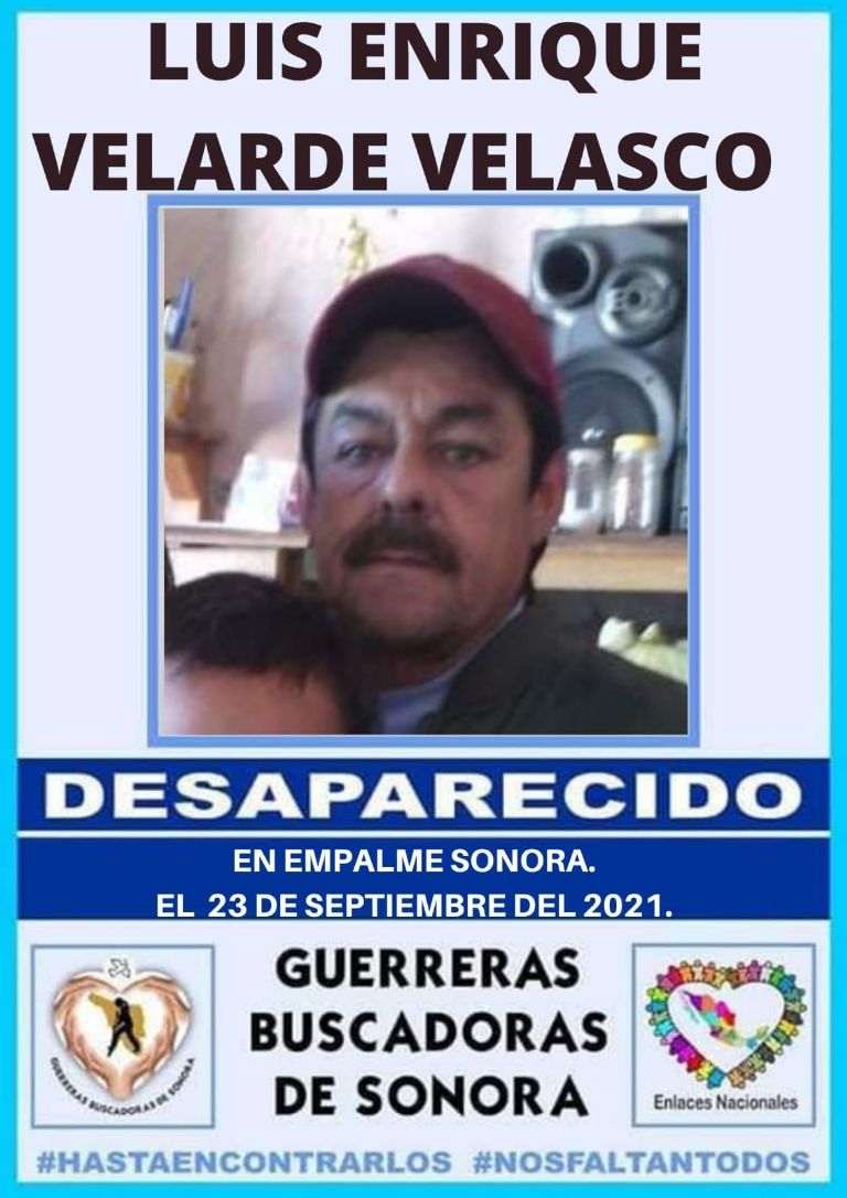 Por su parte, el colectivo Guerreras Buscadoras de Sonora difundió en Facebook la ficha de búsqueda de Velarde Velasco y puso a disposición sus números para cualquier aporte de información que ayude a llevarlo de vuelta a casa.