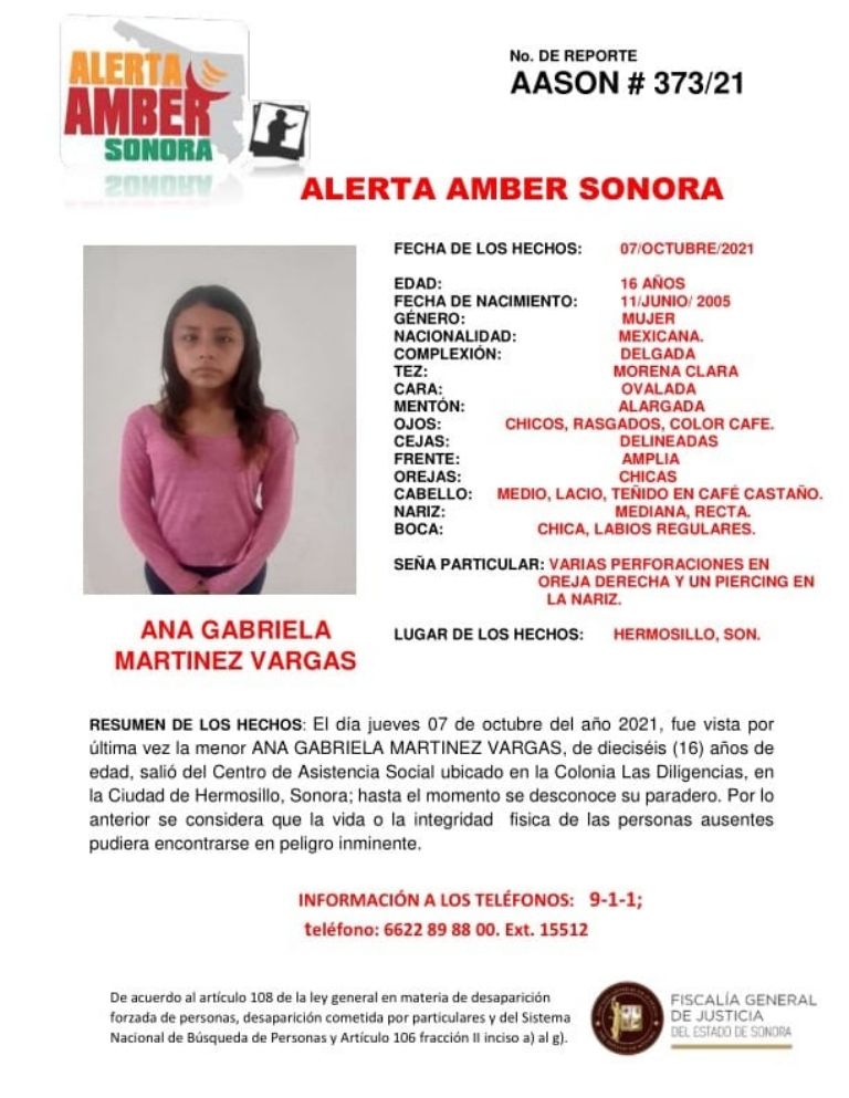 Hermosillo, Sonora.- La tarde de este sábado 9 de octubre se activó la Alerta Amber en Sonora para encontrar a Ana Gabriela Martínez Vargas, joven de 16 años de edad quien desapareció hace varios días en su natal Hermosillo, Sonora.
