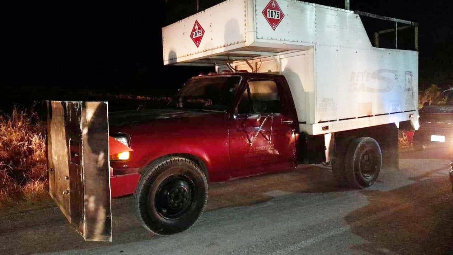 En la grabación de 14 segundos muestra cuando la camioneta gasera, misma que fue modificada con una placa de metal al frente, ingresa al recinto derribando un portón de color blanco, el cual queda en el toldo del vehículo.