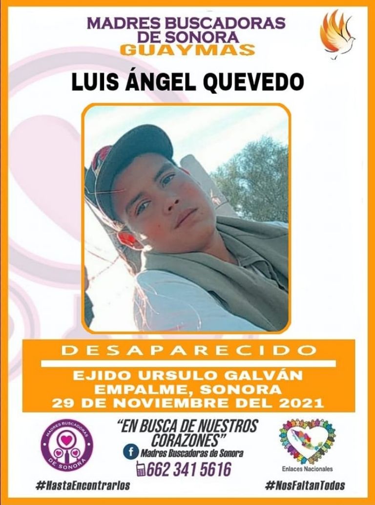 Por su parte, el colectivo Madres Buscadoras de Sonora difundió a través de su cuenta de Facebook la ficha de búsqueda de Luis Ángel Quevedo y pidió a la ciudadanía compartirla para apoyar en su pronta localización.