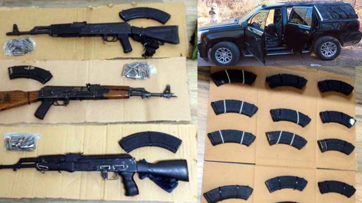 Además, 15 cargadores para arma de fuego calibre 7.62x39 milímetros, 498 cartuchos útiles para arma de fuego calibre 7.62x39 milímetros, tres chalecos balísticos y un vehículo con placa trasera del estado de Sonora (con reporte de robo en Arizona, Estados Unidos).