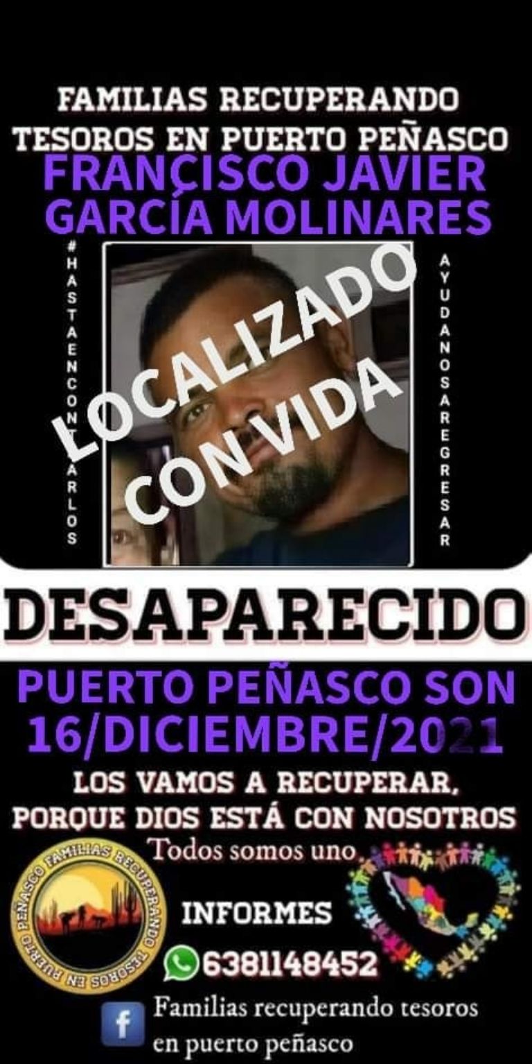 Puerto Peñasco, Sonora.- El colectivo Familias Recuperando Tesoros en Puerto Peñasco informó este miércoles que Francisco Javier García Molinares fue localizado con vida tras ser reportado como desaparecido.