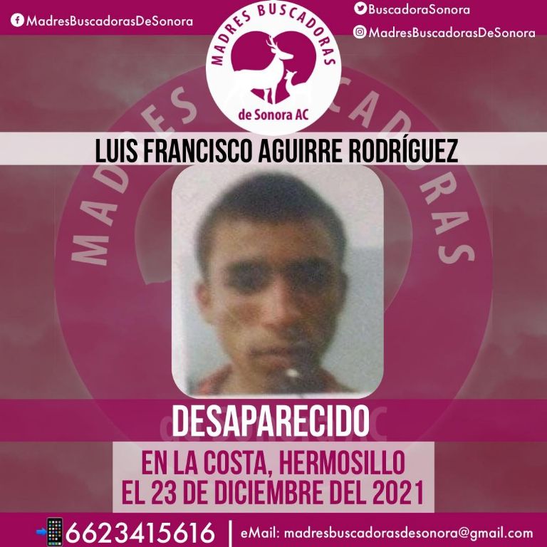 Hermosillo, Sonora.- El colectivo Madres Buscadoras de Sonora reportó la tarde de este lunes la desaparición de Luis Francisco Aguirre Rodríguez, joven del que nada se sabe desde la semana pasada en el municipio de Hermosillo.