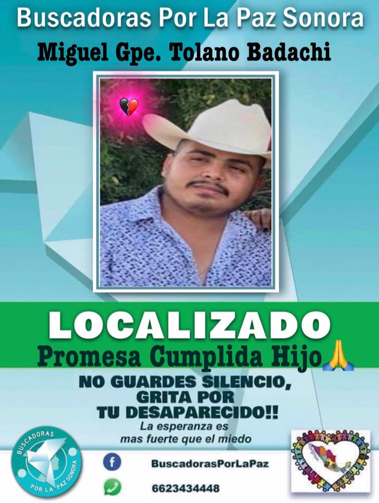 Se trata de Francisca Badachi, quien en días recientes pudo confirmar que el cuerpo de su hijo Miguel Guadalupe Tolano Badachi fue encontrado, aunque no se ofrecieron mayores detalles sobre cómo y cuando ocurrió el hallazgo.