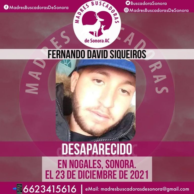 Nogales, Sonora.- El colectivo Madres Buscadoras de Sonora solicita el apoyo de las personas para encontrar a Fernando David Siqueiros, quien se encuentra en calidad de desaparecido en su natal Nogales, Sonora.