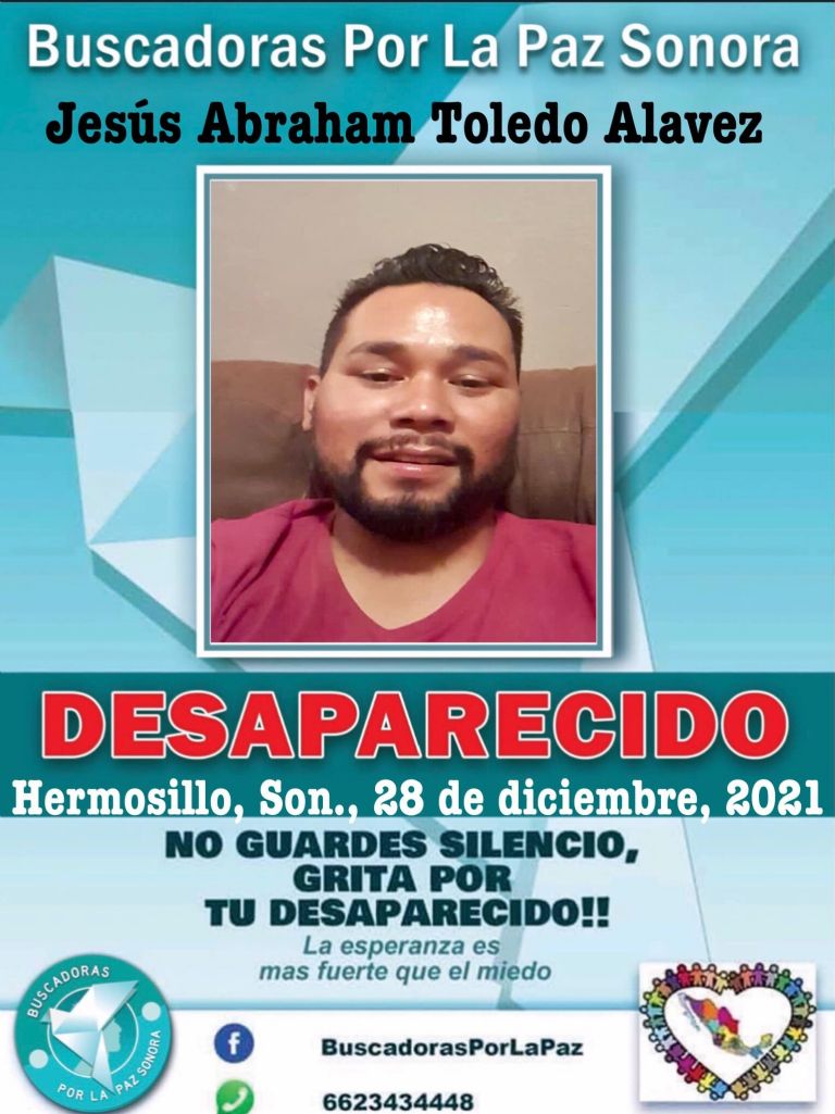 Hermosillo, Sonora.- El colectivo Buscadoras por la Paz pide la colaboración de la comunidad para encontrar a Jesús Abraham Toledo Alavez, quien se encuentra en calidad de desaparecido en Hermosillo, Sonora.