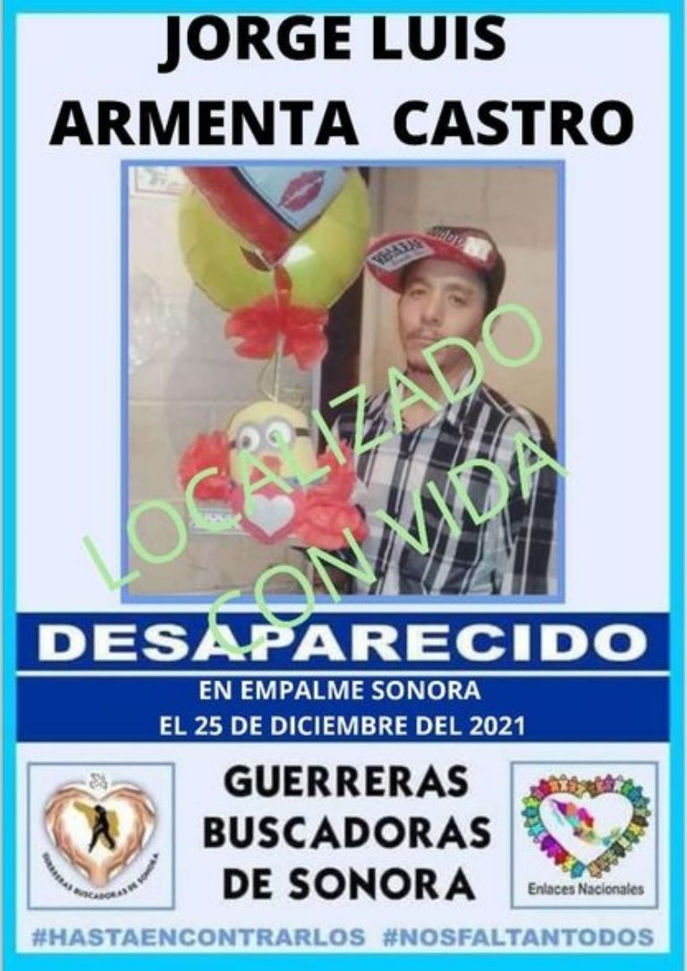 Empalme, Sonora.- El colectivo Guerreras Buscadoras de Sonora informó que Jorge Luis Armenta Castro fue localizado con vida, luego de que desapareciera en pleno día de Navidad en Empalme, Sonora.