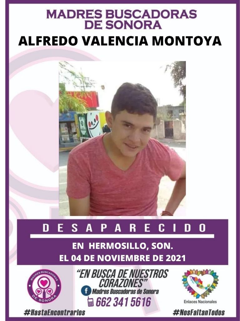 Hermosillo, Sonora.- Este martes, el colectivo Madres Buscadoras de Sonora solicitó la ayuda de la ciudadanía para localizar al joven Alfredo Valencia Montoya, el cual se encuentra desaparecido desde hace poco más de un mes en su natal Hermosillo, Sonora.