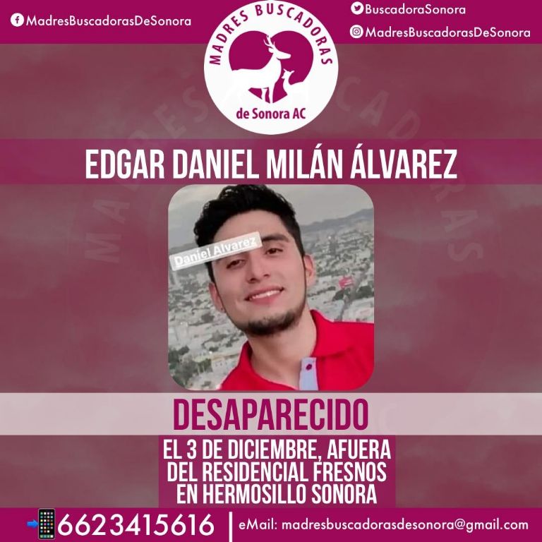 Hermosillo, Sonora.- El colectivo Madres Buscadoras de Sonora pide la ayuda de la comunidad para encontrar al joven Edgar Daniel Milán Álvarez, quien se encuentra desaparecido desde hace varios días en Hermosillo, Sonora.