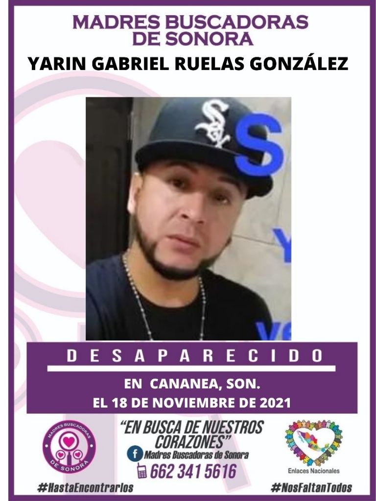 Cananea, Sonora.- El colectivo Madres Buscadoras de Sonora solicita el apoyo de la comunidad para encontrar a Yarin Gabriel Ruelas González, quien se encuentra desaparecido desde el pasado mes en Cananea, Sonora.