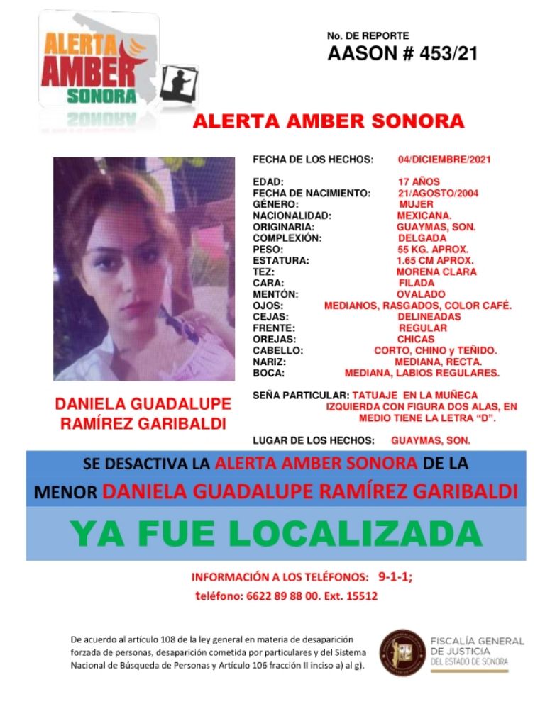 Guaymas, Sonora.- Este jueves, La Fiscalía General de Justicia del Estado (FGJE) de Sonora desactivó la Alerta Amber sobre la desaparición de la joven Daniela Guadalupe Ramírez Garibaldi en Guaymas, Sonora.