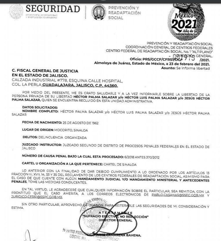 El documento recibido en la Fiscalía General de Justicia de Jalisco indicaba que Héctor Luis 'El Güero' Palma sería liberado por buena conducta, luego de años de encierro por narcotráfico y usurpación.