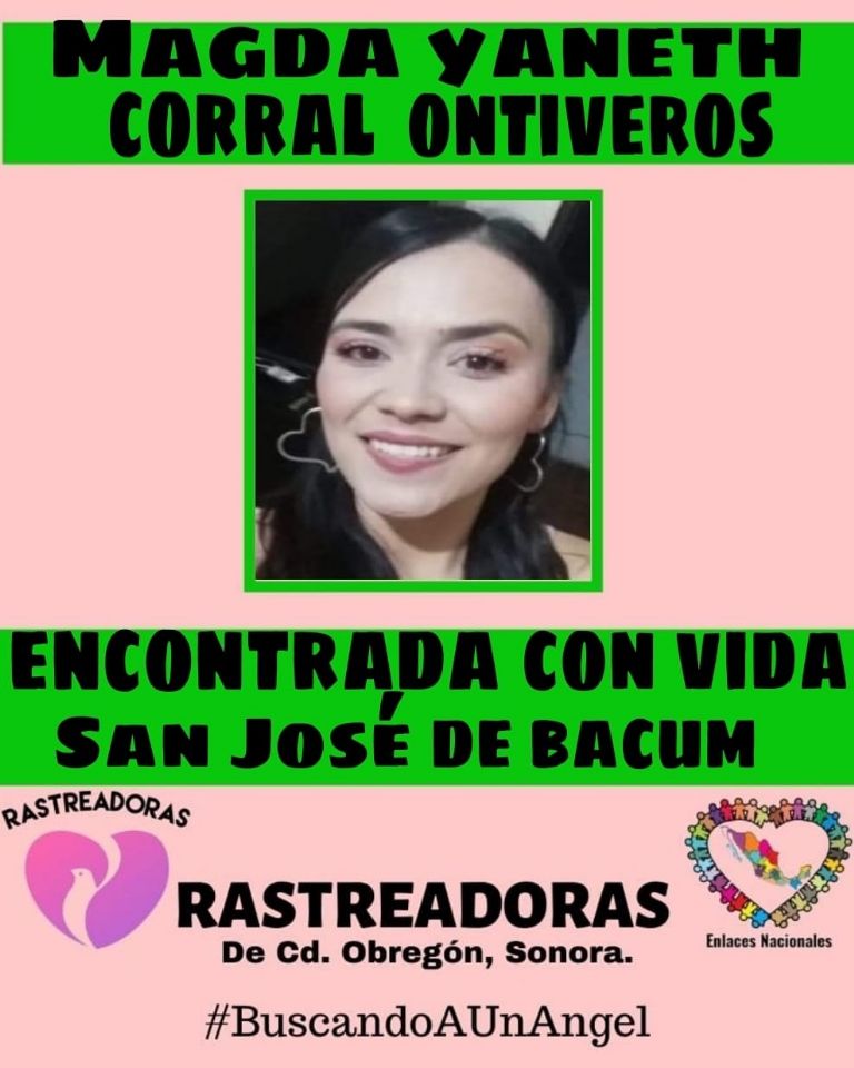 Bácum, Sonora.- Este lunes 12 de abril se informó que Magda Yaneth Corral Ontiveros fue encontrado sana y salva, luego de que el pasado 18 de marzo fuera reportada como desaparecida en el poblado de San José de Bácum.