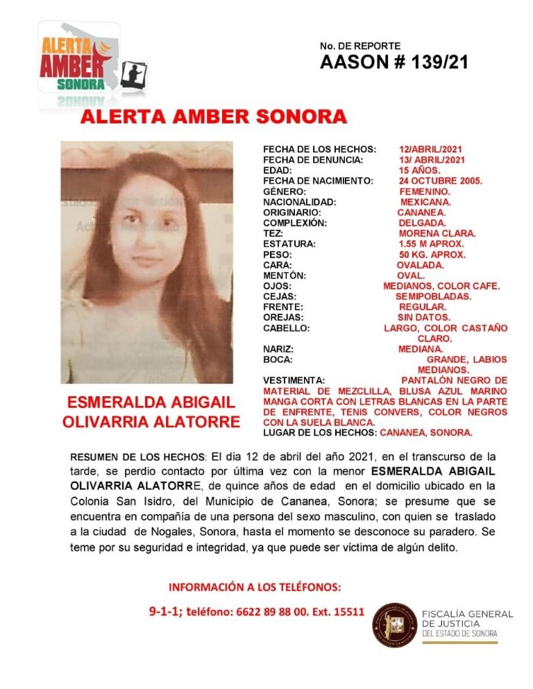 Esmeralda Abigail salió de su vivienda a las 15:50 horas en la colonia San Isidro, en Caborca, y desde ese momento no se volvió a saber de ella. Su familia interpuso una denuncia de desaparición esta mañana de martes ante la Fiscalía General del Justicia del Estado de Sonora.