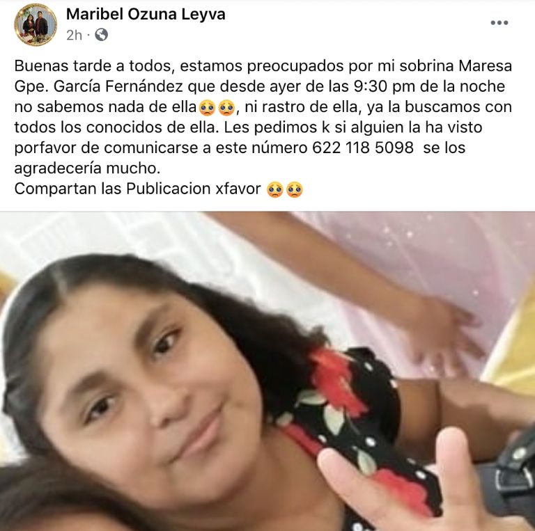 Buenas tarde a todos, estamos preocupados por mi sobrina Maresa Gpe. García Fernández que desde ayer de las 9:30 pm de la noche no sabemos nada de ella, ni rastro de ella, ya la buscamos con todos los conocidos".