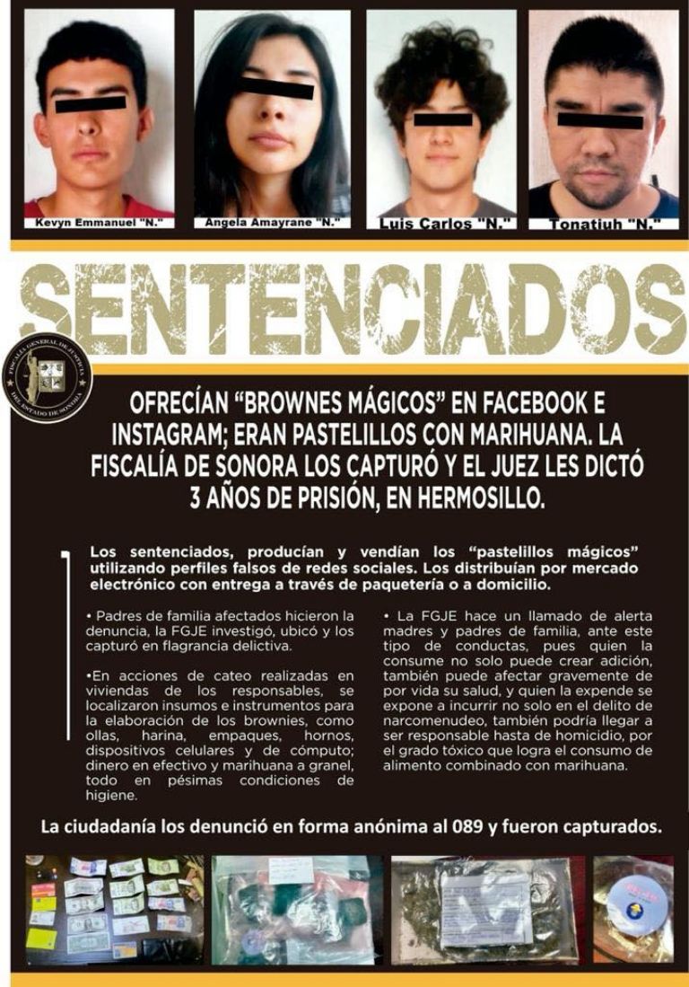 Hermosillo, Sonora.- Cuatro personas pensaron que vender drogas en pastelillos sería gran negocio, pero ahora cumplirán la pena de 3 años en prisión, luego de las investigaciones realizadas por personal de la Fiscalía General de Justicia del Estado (FGJE) de Sonora .