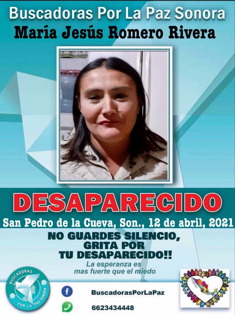 A través de redes sociales, el grupo de rastreadoras publicó la ficha de búsqueda María de Jesús Romero Rivera y detallaron que la última vez que fue vista fue el pasado 12 de abril, momento en que se perdió toda comunicación con ella.