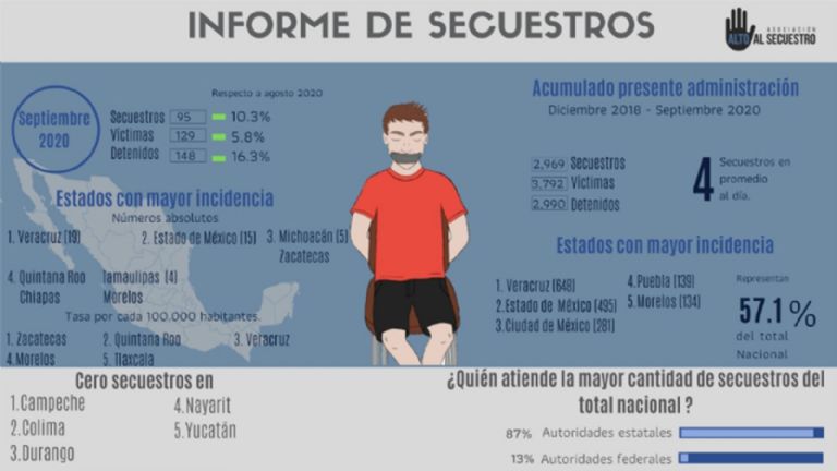 De acuerdo con cifras de la organización Alto al Secuestro, en 2020 se registraron mil 151 casos de secuestros en México. Las entidades en donde mayor incidencia se presentó fueron Veracruz, con 209; Estado de México, con 203; Morelos, con 58; Michoacán, con 51; así como Puebla y Ciudad de México, ambas con 47.