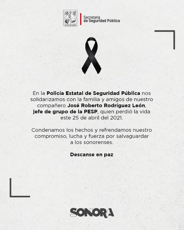 Hermosillo, Sonora.- La Policía Estatal de Seguridad Pública (PESP) condena y lamenta el fallecimiento de jefe de grupo, José Roberto Rodríguez León, quien era conocido entre sus compañeros como el 'Comandante Perrada'.